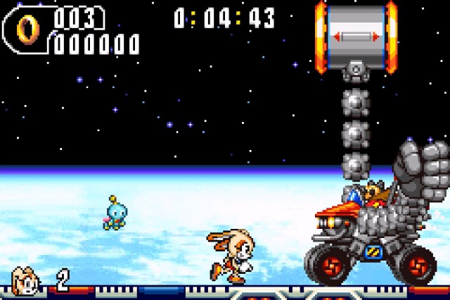 This doesn’t make Sonic Advance 2 impossible to beat, just frustrating in the wrong ways. The boss stages only seek to enhance this frustration as well; each boss is now an auto-runner stage, which sees you struggling against the tide just for the opportunity to land a hit on Eggman. Much like the levels themselves, these aren’t too bad at first, but get really annoying later on, mostly because of their auto-running nature and some really irritating design choices (instant death slaps from a giant robot hand for example). This assumes of course that you aren’t playing the game as Sonic series newcomer Cream the Rabbit, who absolutely demolishes the bosses thanks to her ability to launch Cheese the Chao into the face of a poor, unsuspecting scientist.
