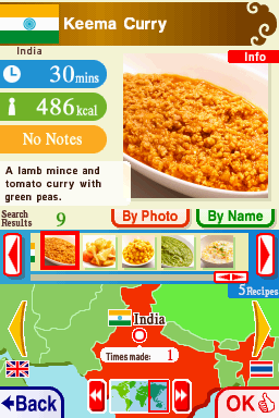 Obviously I can’t talk about Cooking Guide the same way I would talk about say, Sonic Advance or even Hotel Dusk. Instead I want to walk you through the entire Cooking Guide experience and that way we can talk a little more about what it does right and where it occasionally falters. So to start with, we of course need to choose a recipe and this is a place where Cooking Guide definitely excels. While writing this piece, my partner said that she was in the mood for a curry, which was a very good lead to get us started. Searching with the keyword ‘curry’ netted me 9 different recipes to choose from and from there, I personally picked out the ‘Keema Curry’.